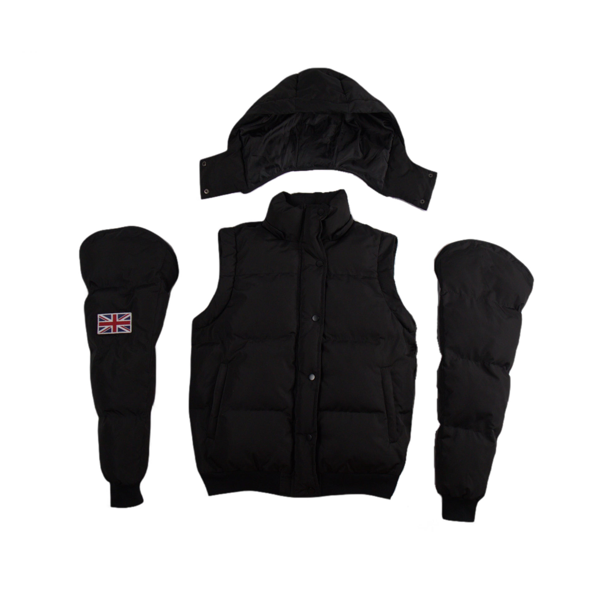 This 2 in 1 jacket features detachable sleeves, a removable flag patches (USA, UK, Japan), a comic on the inside, and a water-repellent outer material.